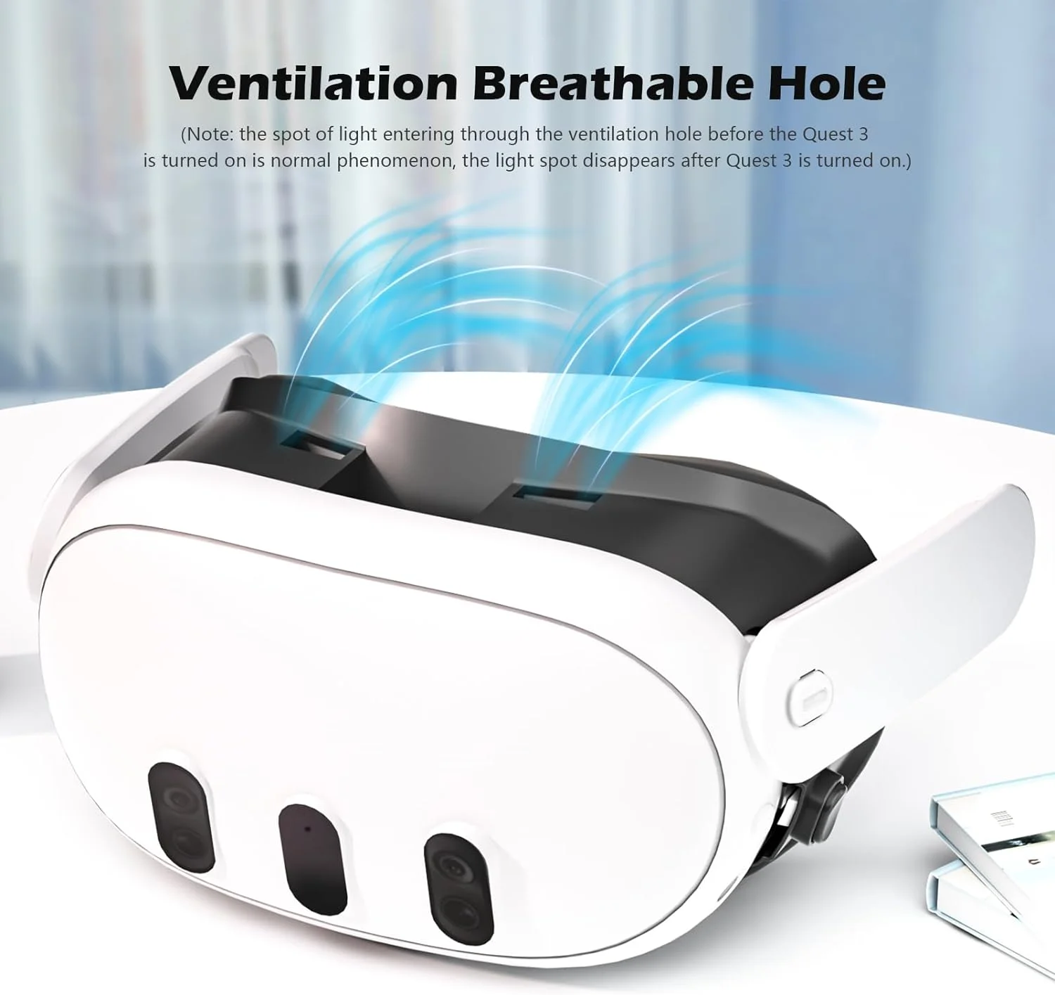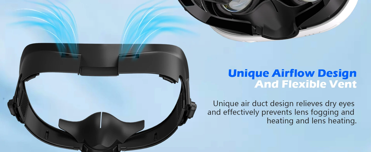 DISEÑO TRANSPIRABLE Y FRESCO: La parte superior de la interfaz facial está diseñada con dos orificios de ventilación, que pueden reducir eficazmente la incomodidad de los juegos prolongados y mejorar los defectos de la cubierta facial original que se cierra y se acumula sudor.(Nota: cuando el dispositivo VR no está encendido, los puntos de luz a través de los orificios de ventilación son normales, cuando el dispositivo VR está encendido, ya no existirán los puntos de luz).