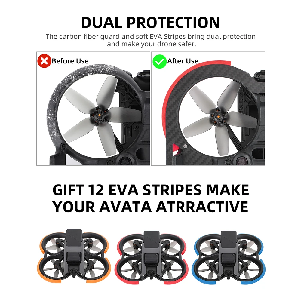 1. Protección dual:El protector de hélice ofrece protección dual: un tablero de fibra de carbono mejorado y una tira Anticolisión de EVA suave y de alto rebote para resistir eficazmente los impactos y proporcionar amortiguación y absorción de impactos. La doble protección garantiza una mayor tranquilidad.