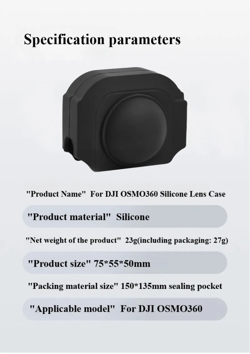 "1.Una cubierta de lente de silicona diseñada específicamente para la cámara panorámica Dji 360, con orificios alineados con precisión en ambos lados de la lente y un diseño elevado para evitar el desgaste de la lente o el contacto directo con ella.