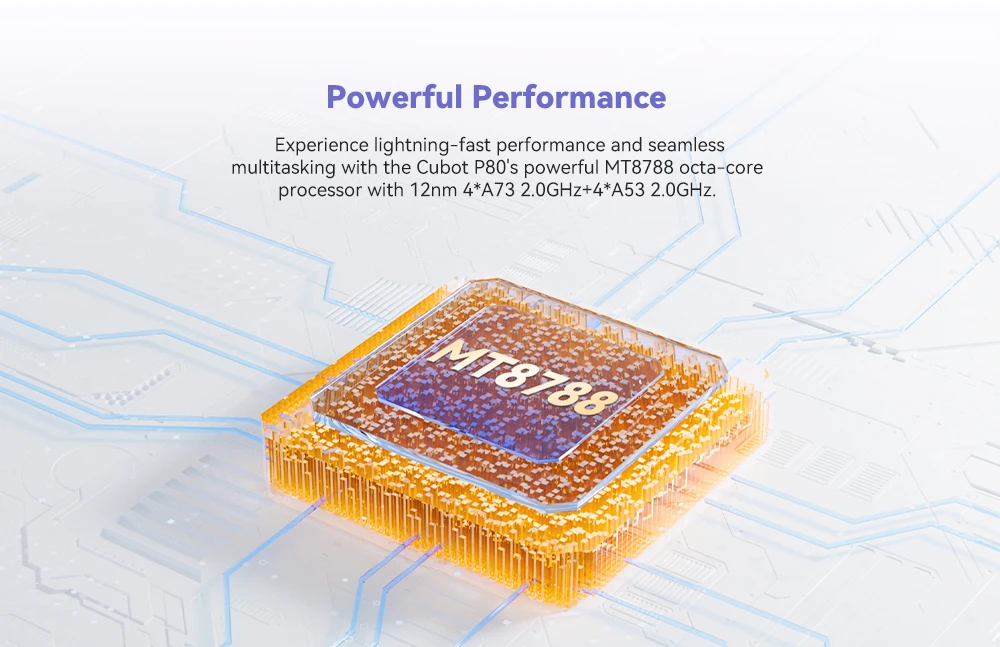 Experience lightning-fast performance and seamless multitasking with the Cubot P80's powerful MT8788 octa-core processor with 12nm 4*A73 2.0GHz+4*A53 2.0GHz.
