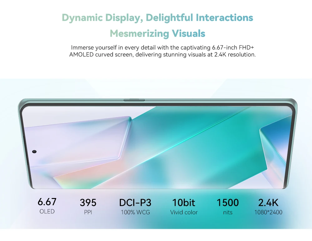 Sumérjase en cada detalle con la cautivadora pantalla curva FHD + AMOLED de 6,67 pulgadas, que ofrece imágenes impresionantes con una resolución de 2,4 K.