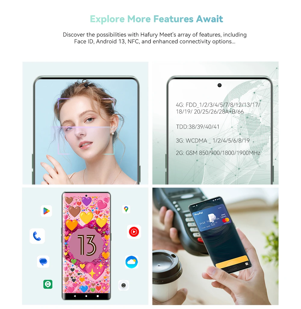 Descubra las posibilidades con la variedad de características de Hafury Meet, incluyendo Face ID, Android 13, NFC y opciones de conectividad mejoradas