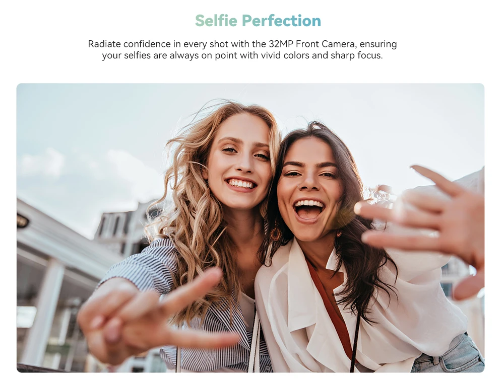 Irradia confianza en cada toma con la cámara frontal de 32MP, asegurando que tus selfies estén siempre a punto con colores vivos y enfoque nítido.