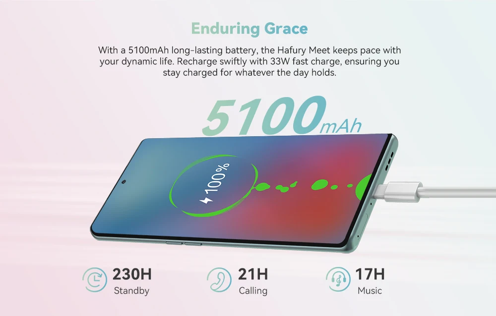 Con una batería de larga duración de 5100mAh y carga rápida de 33W, El Hafury Meet mantiene el ritmo de su vida dinámica, asegurando que se mantenga cargado para lo que le depare el día, proporcionando gracia duradera y confiabilidad.