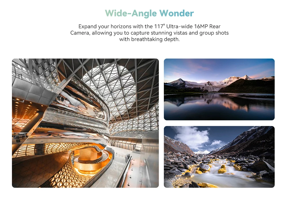 Amplía tus horizontes con la cámara trasera ultra ancha de 16MP de 117 °, que te permite capturar impresionantes vistas y tomas grupales con una profundidad impresionante.