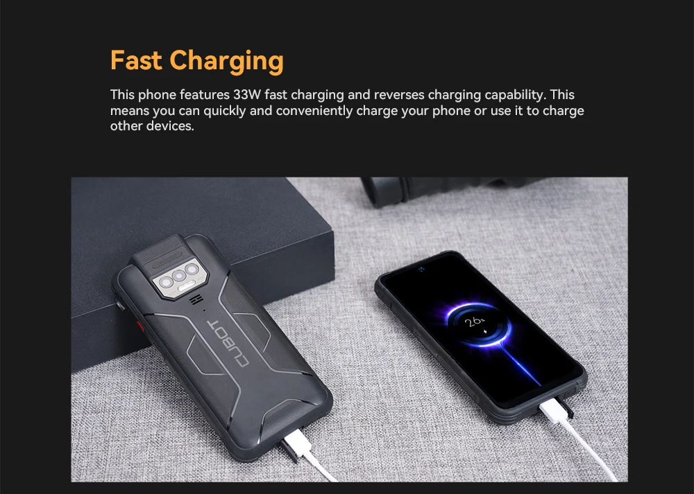 Este teléfono cuenta con carga rápida de 33W y capacidad de carga inversa. Esto significa que puede cargar rápida y cómodamente su teléfono o usarlo para cargar otros dispositivos.