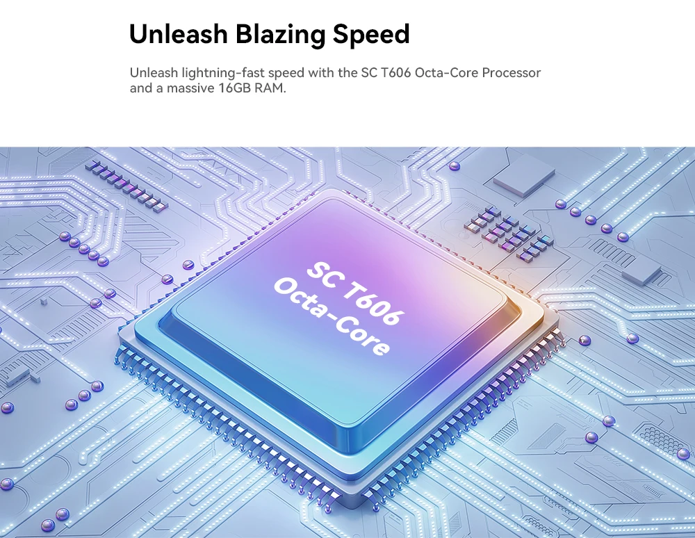 Libera la velocidad ultrarrápida con el procesador Octa-Core SC T606 y una enorme RAM de 16GB.