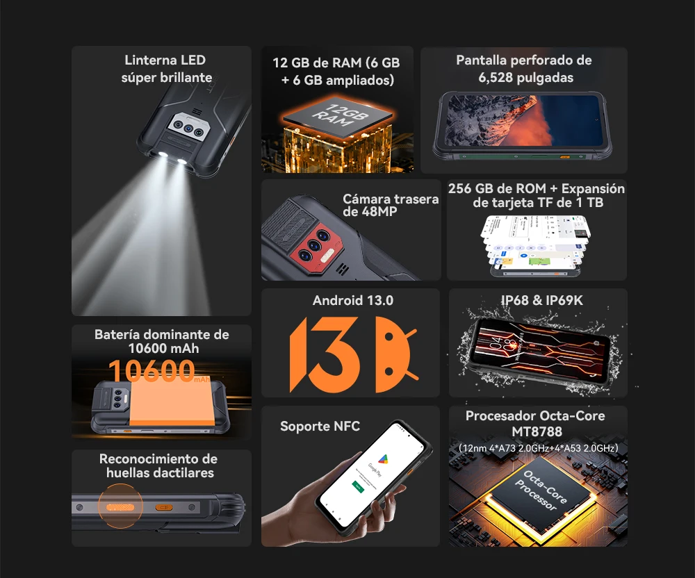 Comprar Cubot Smartphone Android resistente al agua KingKong 8, 12GB RAM(6GB+6GB), 256GB ROM, 10600mAh, NFC, Octa-core, teléfono 4G, OTG