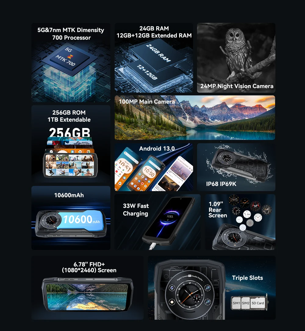 Comprar Cubot-smartphone KingKong Star, resistente al agua, 5G, 24GB(12GB + 12GB) de RAM, 256GB de ROM, batería de 10600mAh, pantalla 2K de 6,78 pulgadas, cámara de 100MP, NFC