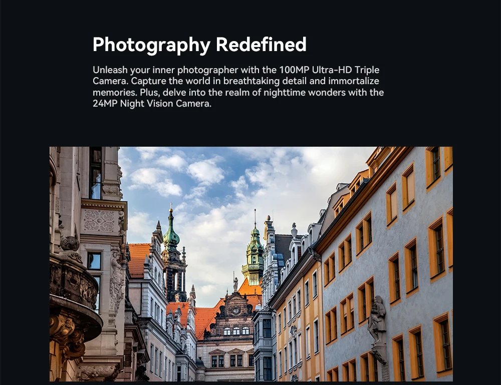 Dé rienda suelta a su fotógrafo interior con la triple Cámara Ultra-HD de 100MP. Captura el mundo con detalles impresionantes e inmortaliza recuerdos. Además, sumérgete en el reino de las Maravillas nocturnas con la cámara de visión nocturna de 24MP.