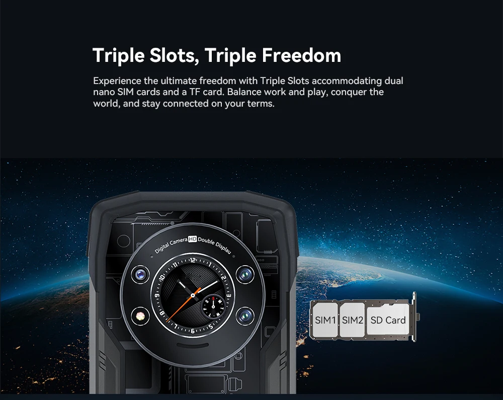 Experimente la máxima libertad con las ranuras triples que admiten tarjetas nano SIM duales y una tarjeta TF. Equilibra el trabajo y el juego, conquista el mundo y mantente conectado a tu gusto.
