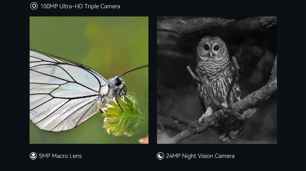 Dé rienda suelta a su fotógrafo interior con la triple Cámara Ultra-HD de 100MP. Captura el mundo con detalles impresionantes e inmortaliza recuerdos. Además, sumérgete en el reino de las Maravillas nocturnas con la cámara de visión nocturna de 24MP.