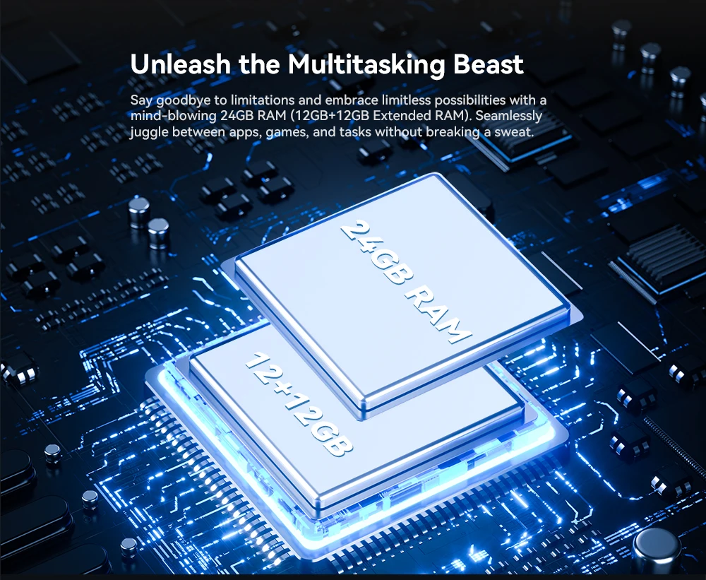 Diga adiós a las limitaciones y aproveche las posibilidades ilimitadas con una memoria RAM de 24GB alucinante (12GB + 12GB RAM extendida). Haz malabares sin problemas entre aplicaciones, juegos y tareas sin sudar.