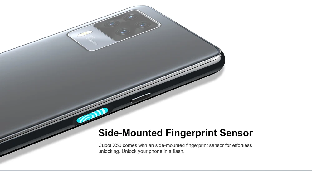 Cubot X50 viene con un sensor de huellas dactilares montado en un lateral para un desbloqueo sin esfuerzo. Desbloquea tu teléfono con un flash.