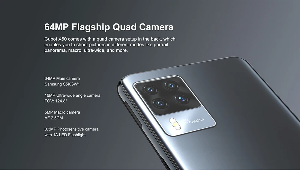 Cubot X50 viene con una Configuración de cámara cuádruple en la parte posterior, que le permite grabar imágenes en diferentes modos como retrato, macro, ultraancho y más.