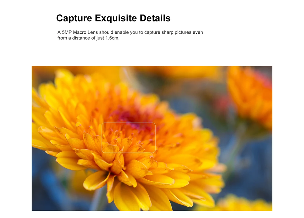 Una lente Macro de 5MP debería permitirle capturar imágenes nítidas incluso desde una distancia de solo 1,5 cm.
