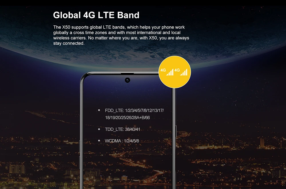 El X50 es compatible con bandas LTE globales, lo que ayuda a que tu teléfono funcione a nivel global a zonas horarias cruzadas y con la mayoría de los operadores inalámbricos internacionales y locales. No importa dónde esté, con X50, siempre estará conectado.