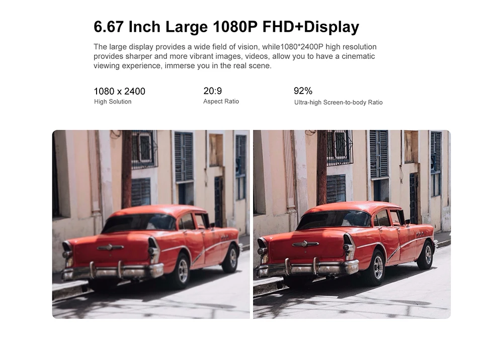 La gran pantalla proporciona un amplio campo de visión, con una alta resolución de 1080*2400P que proporciona imágenes y vídeos más nítidos y vibrantes, le permite tener una experiencia de visualización cinematográfica, te sumerge en la escena real.