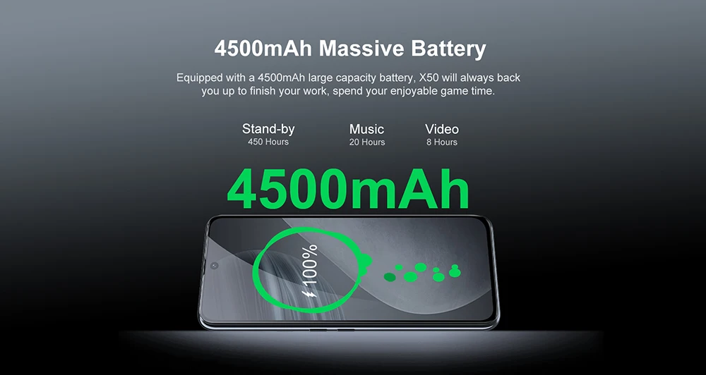 Equipado con una batería de gran capacidad de 4500mAh, X50 siempre le respaldará para terminar su trabajo y pasar su tiempo de juego agradable.