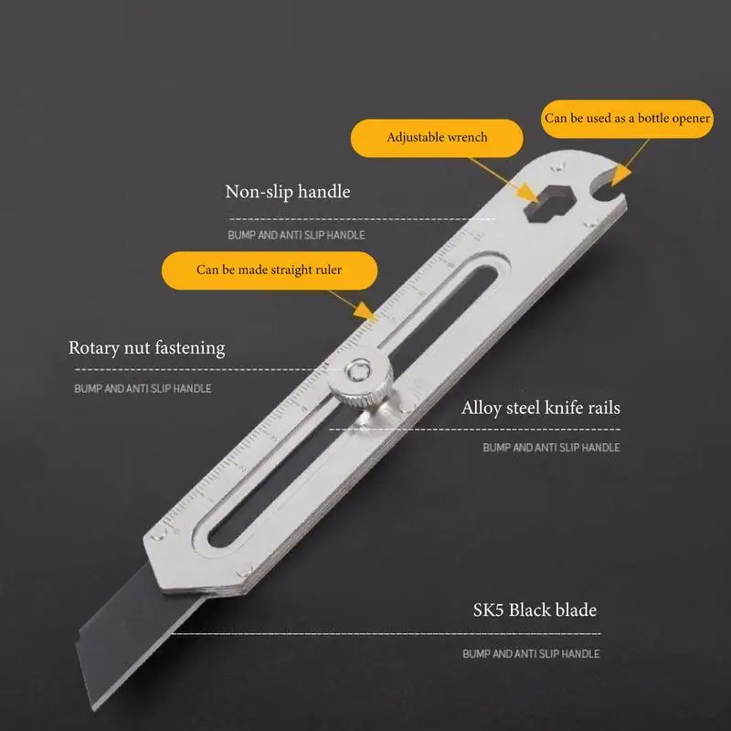 5. Amplias aplicaciones: Con su capacidad para manejar una variedad de tareas diarias, este cortador de utilidad es una herramienta adecuada para hogares y profesionales. Con un martillo de seguridad, una regla y más, proporciona muchos usos para diversas necesidades, por lo que es una adición versátil a cualquier kit de herramientas.