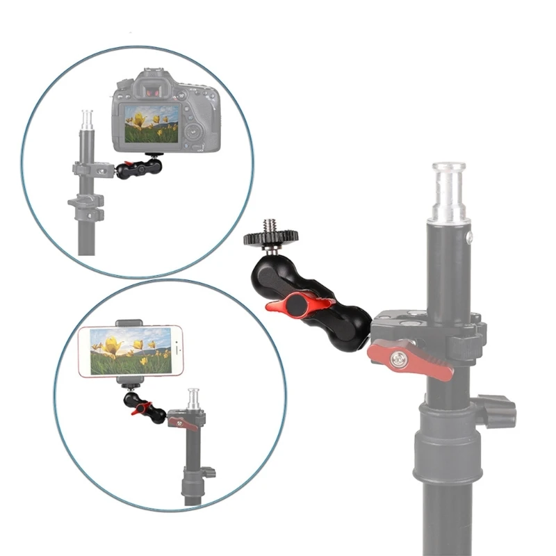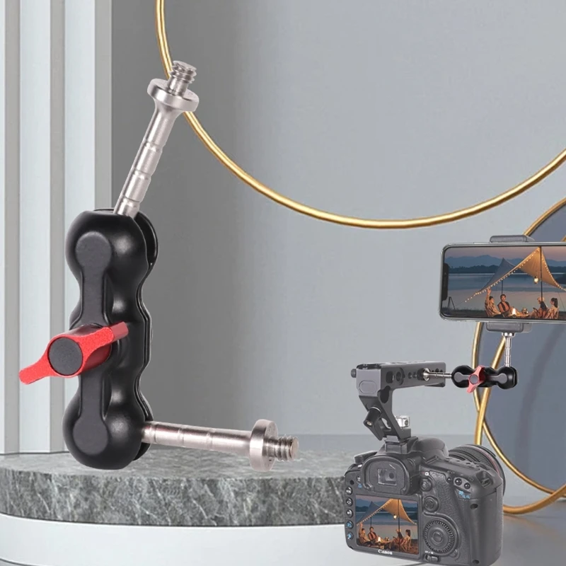 Características:OOTDTYExperimente una versatilidad incomparable con nuestro soporte de súper abrazadera con brazo esférico, que cuenta con soportes de rosca de 1/4 y 3/8 para una compatibilidad perfecta con DSLR, monitores LCD, linternas LED y más.