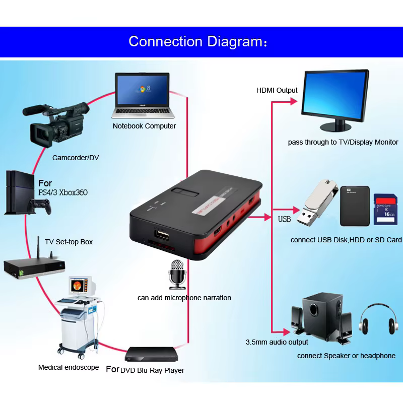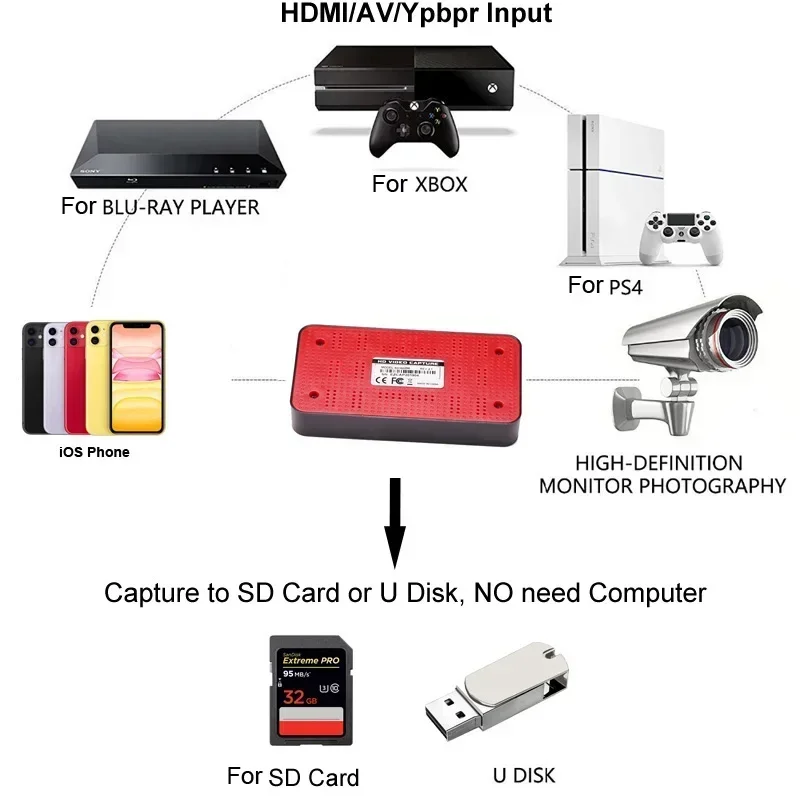 it can record various videos from HDMI or AV output devices,such as HDMI DVD Player /