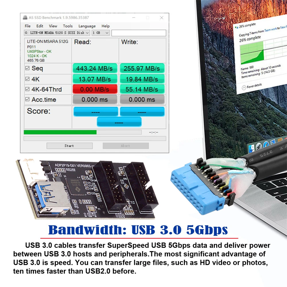 Salida dual USB 3,0 de 20 pines: compatible con la mayoría de dispositivos USB 3,0 de 20 pines como panel frontal, cable, concentrador USB, lector de tarjetas, etc.