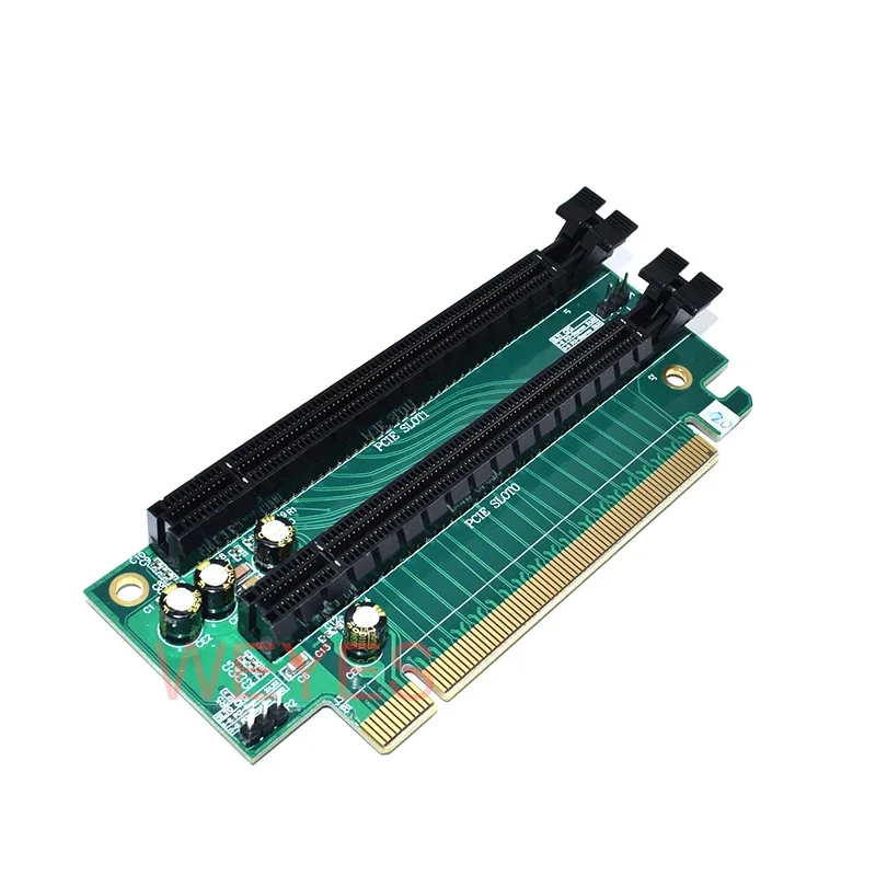 Este NO es un elevador de bifurcación. Listo con cero manual. Es un elevador para PCI-express que ocupa una ranura y otorga 2, pero hice un orden para que funcione. Cada una de las ranuras pcie tiene 3 cabezales de puente que se supone cambiar entre 1x-16x O 4x-8x, pero se entregó sin puentes. Probé todas las combinaciones posibles pero nunca logré que la ranura superior funcione. Ni siquiera entiendo qué propósito se supone servir.