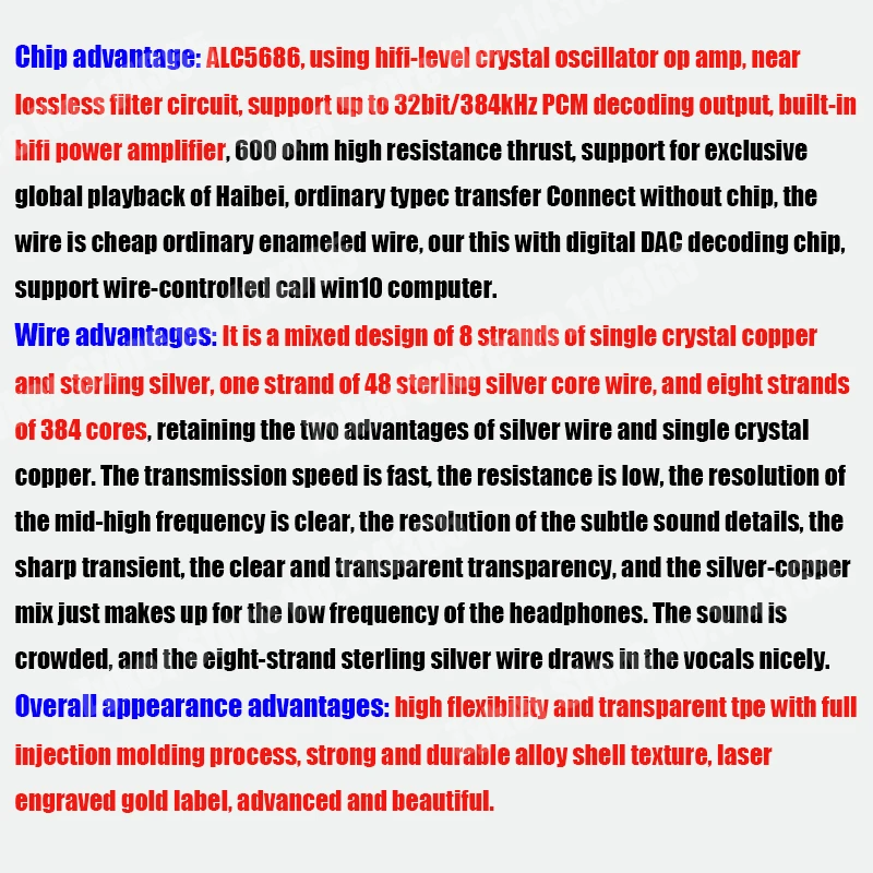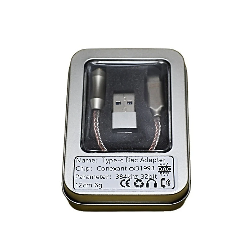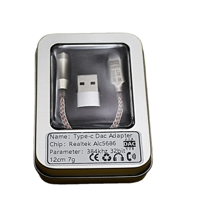 Modelo: Versión ALC5686 Modelo de Chip: ALC5686 Interfaz: TIPO C a 3,5 Longitud total: 13cm Empuje: 65mW(329) Frecuencia de muestreo DAC: 32bits/384KHz Relación señal-ruido/SNR: 125dB Rango dinámico/DNR: 100dB Distorsión/THD + N: 95db THD + N: 0.0003% DSD: 64/128 (PCM) Alambre: 4 hebras de cobre monocristalino + 4 de plata esterlina mezcladas con un total de 8 hebras Compatible con 95% de los teléfonos móviles tipo C del mercado y sistema win10 ordenador del sistema Apple