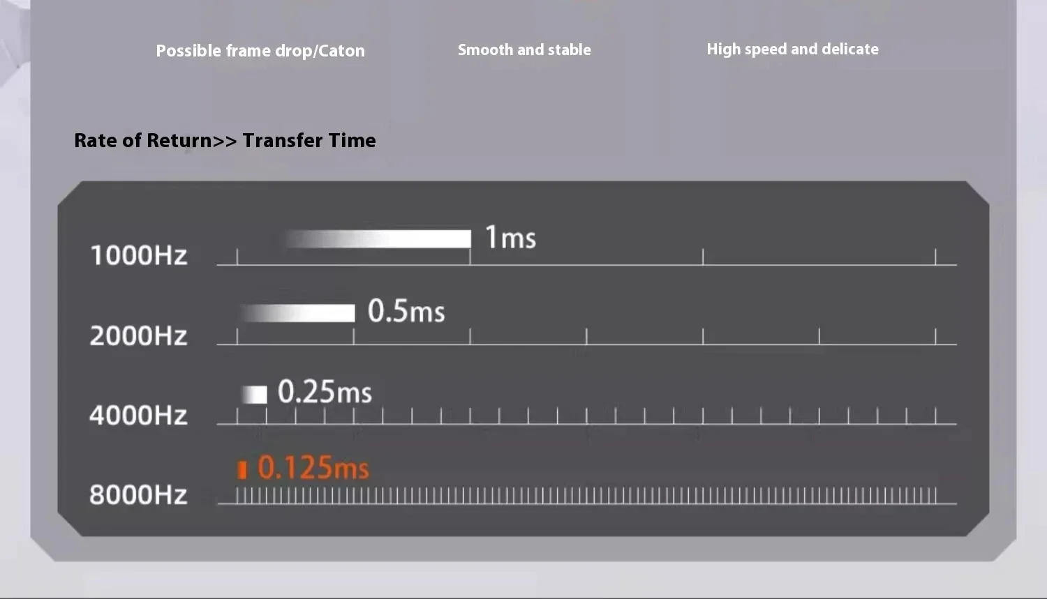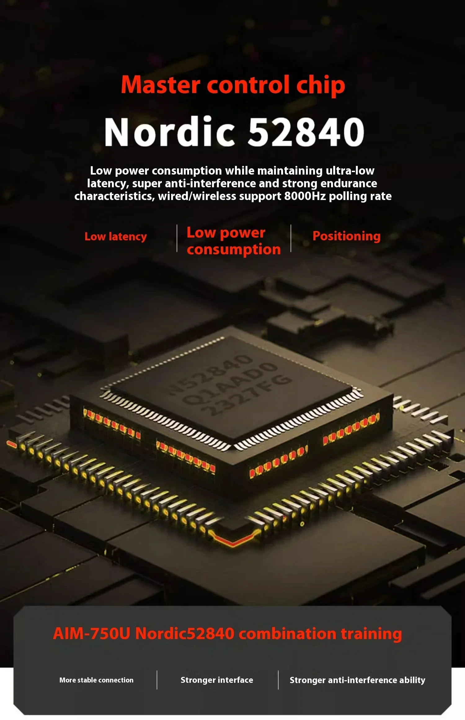 1.Equipado con chip de control principal Nordic 52840, que presenta bajo consumo de energía, latencia ultrabaja, fuerte antiinterferencia y batería de larga duración.Tanto con cable como inalámbrico admiten una velocidad de sondeo de 8000 Hz.