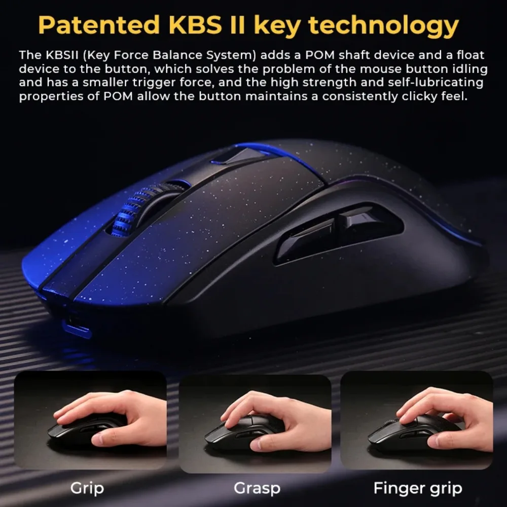 El KBSII (Key Force Balance System) agrega un dispositivo de eje POM y un dispositivo de flotación al botón, lo que resuelve el problema del botón del ratón al ralentí y tiene una fuerza de disparo más pequeña, Y las propiedades de alta resistencia y autolubricación del POM permiten que el botón mantenga una sensación de clic constante.