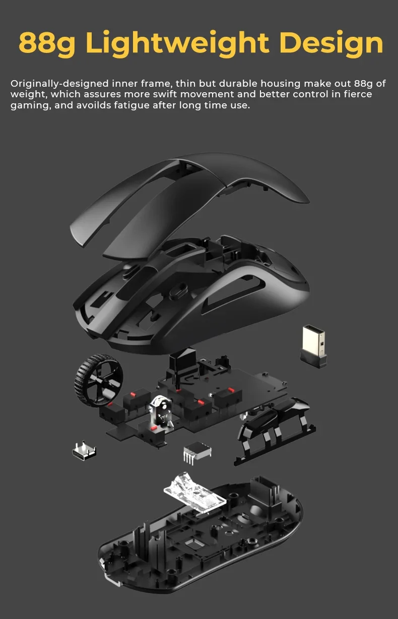 Marco interno diseñado originalmente, carcasa delgada pero duradera que hace 88g de peso, lo que asegura un movimiento más rápido y un mejor control en juegos feroces, y evita la fatiga después de un uso prolongado.