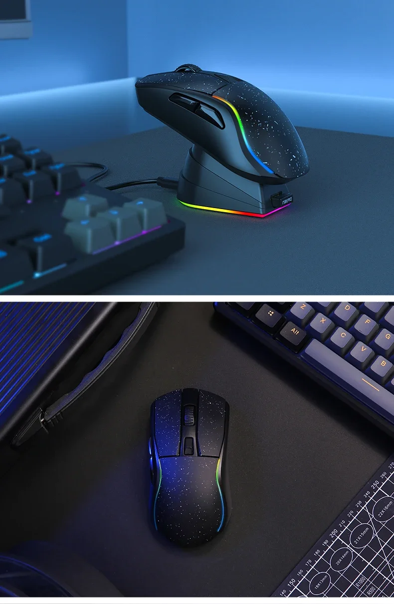 El ratón está equipado con una exclusiva base de carga de color mágico, que se puede cargar directamente en la base por adsorción, que es conveniente y rápida y está equipada con una variedad de iluminación RGB, haciendo que el streamer de escritorio sea hermoso.