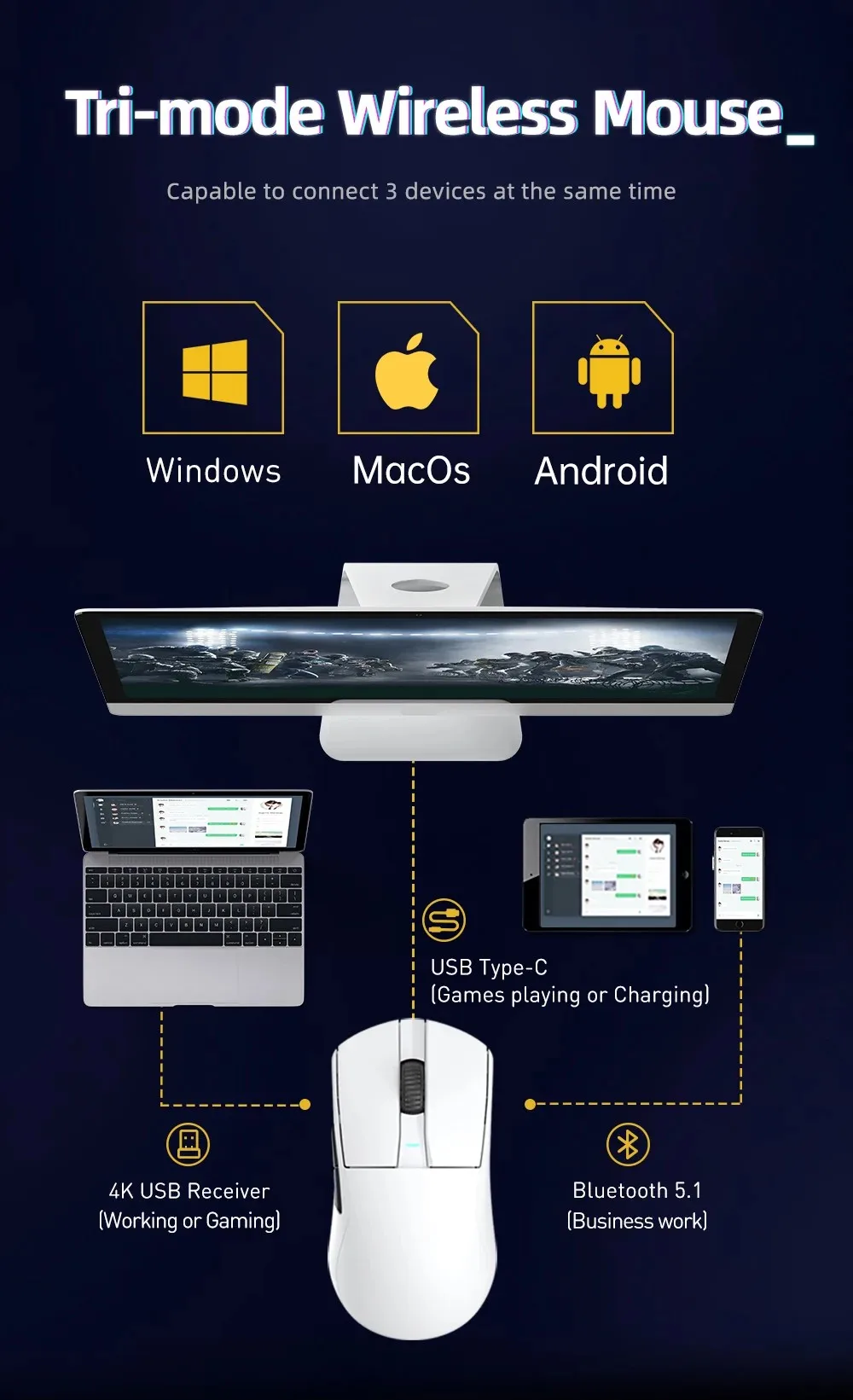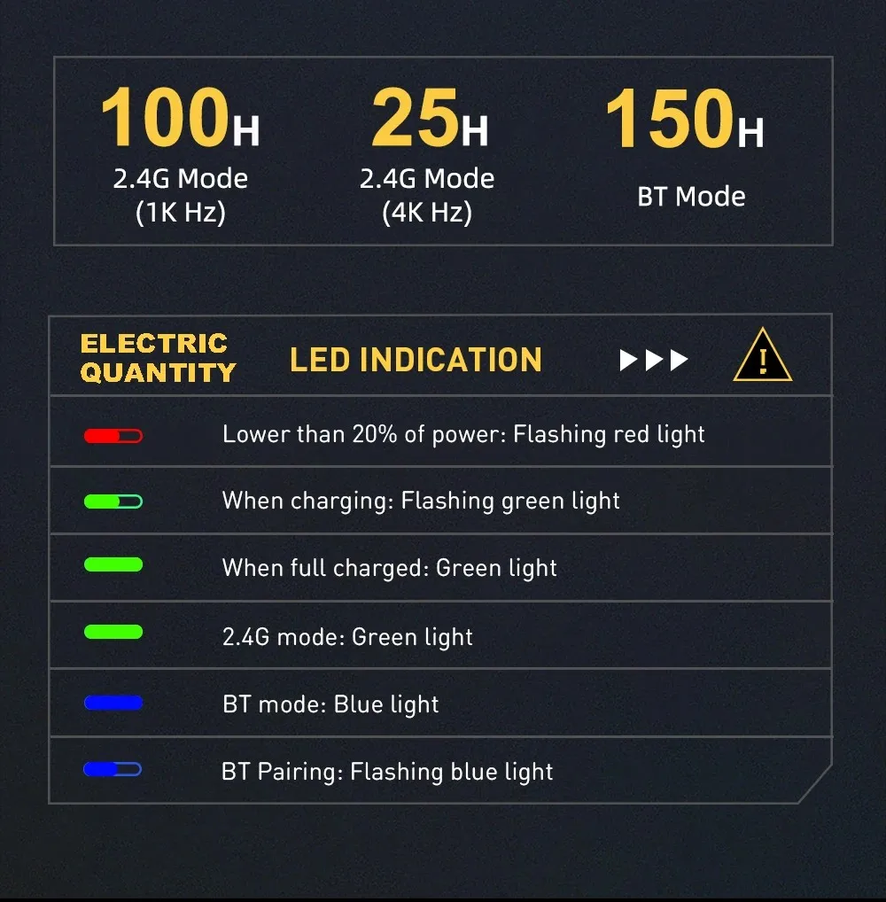 Velocidad de informes (por cable /2,4G): 1000/4000 Hz (con receptor 4K); (BT): 135 Hz