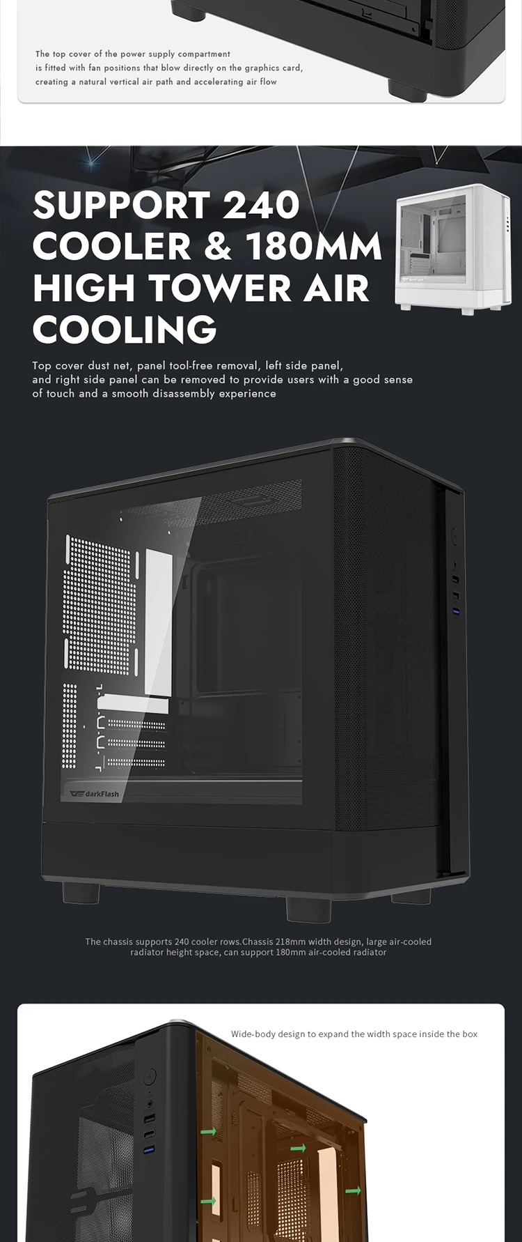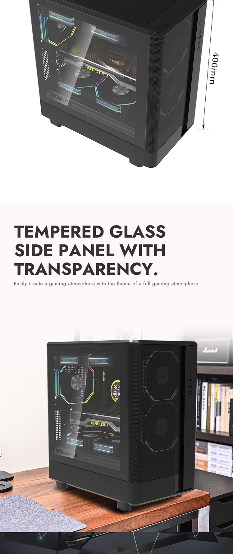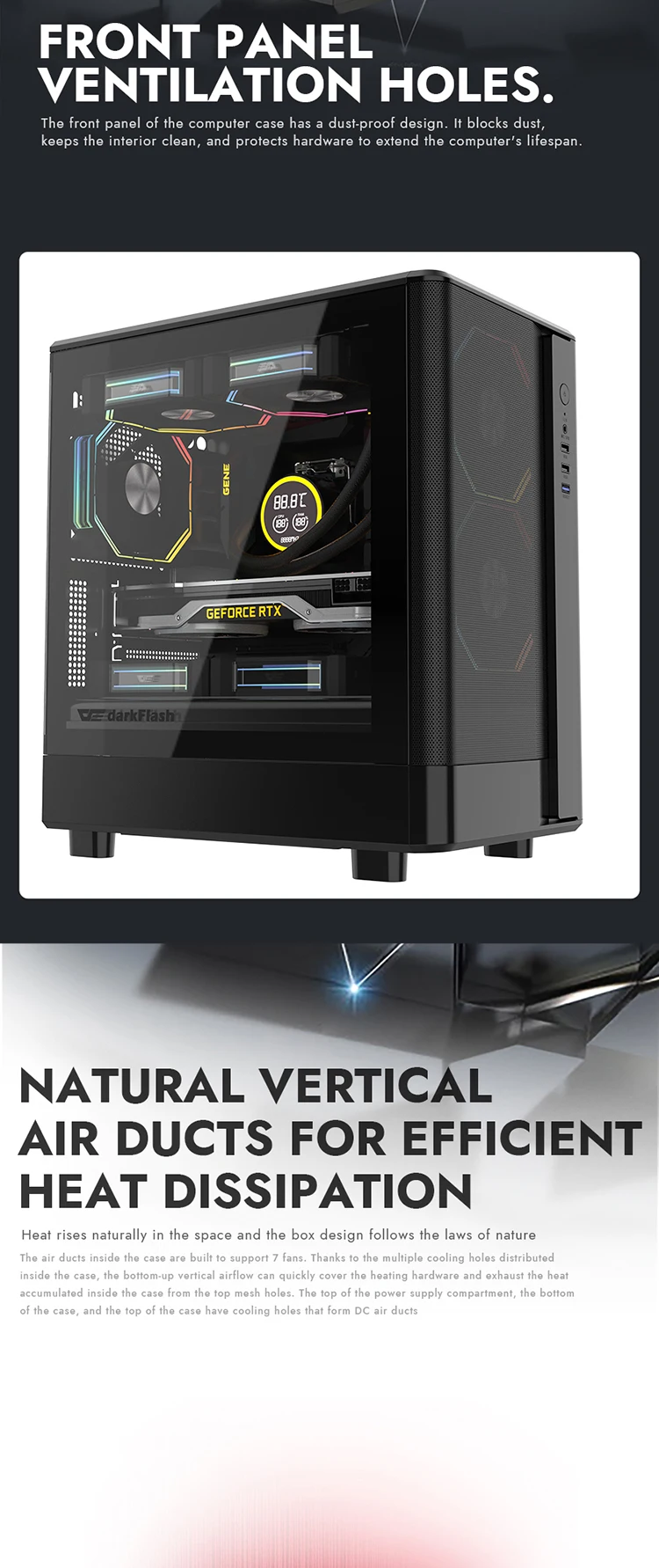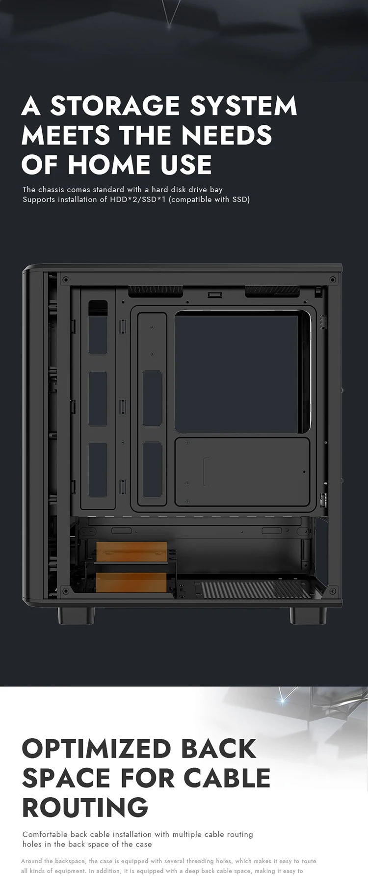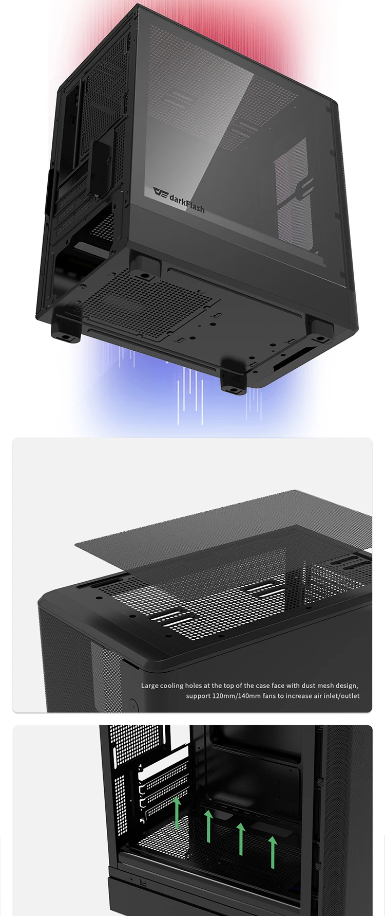 (1) El panel frontal utiliza un diseño de rejilla fresca, que mejora eficazmente la circulación del flujo de aire en el chasis y aumenta el efecto de disipación de calor.