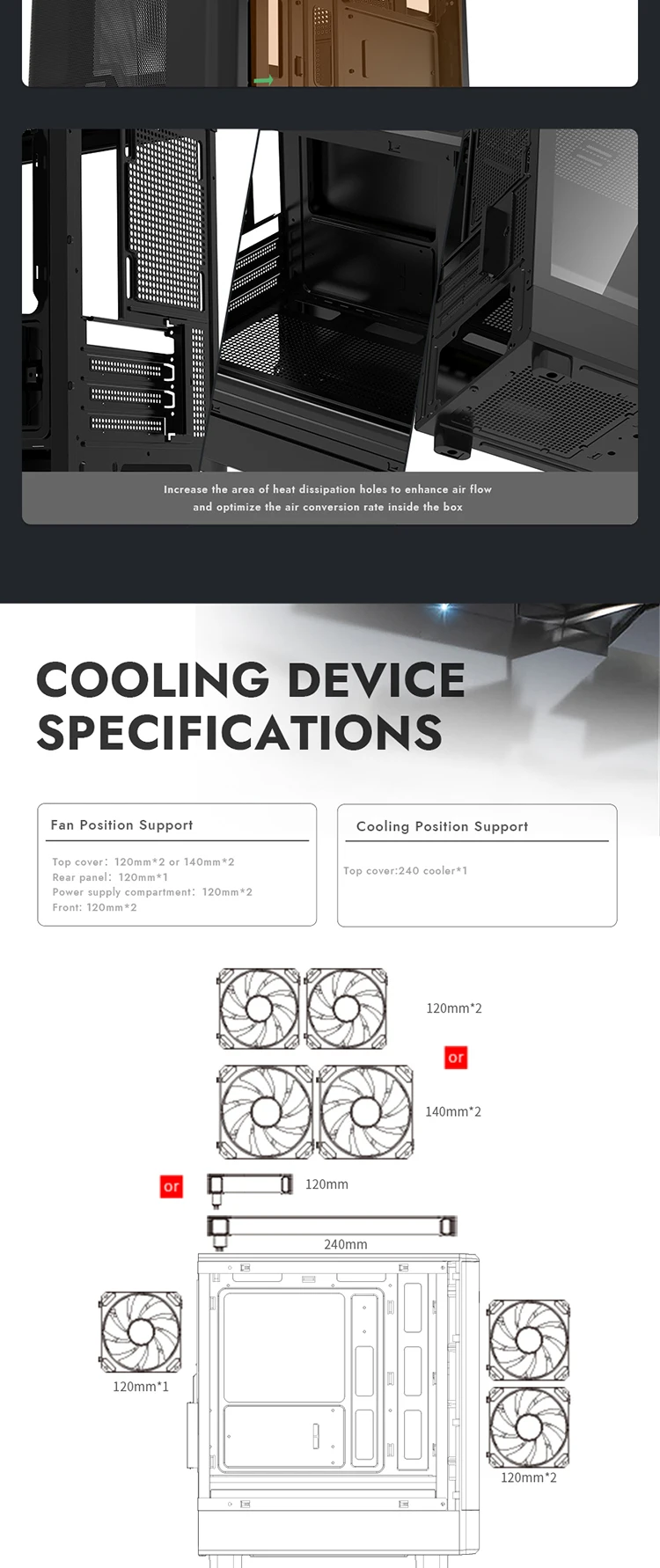 (3) Admite hasta 120 mm * 7/140 mm * 2 arena de ventilador radiador de 240 mm