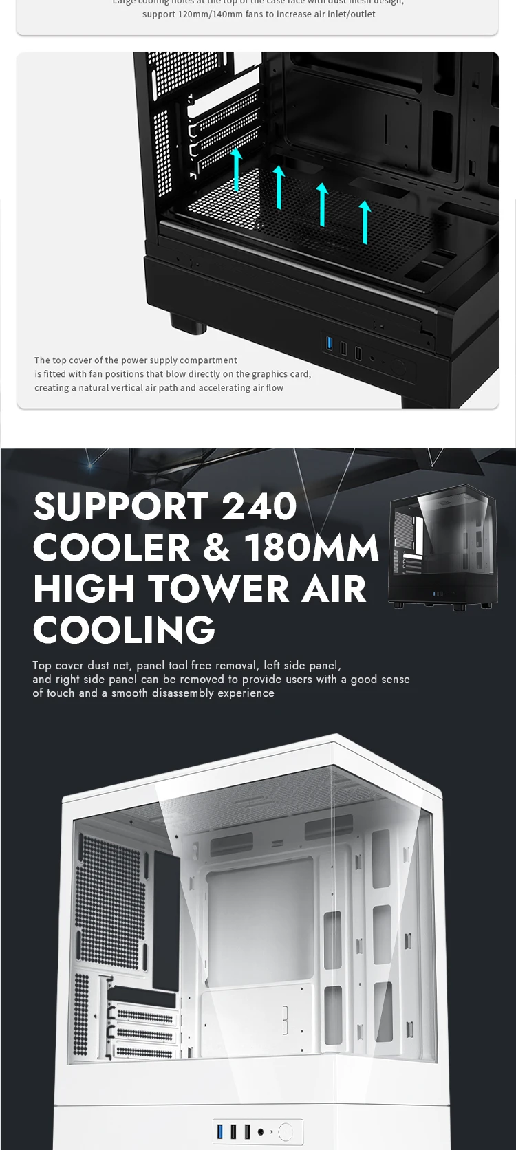 (1) El panel frontal utiliza un diseño de rejilla fresca, que mejora eficazmente la circulación del flujo de aire en el chasis y aumenta el efecto de disipación de calor.