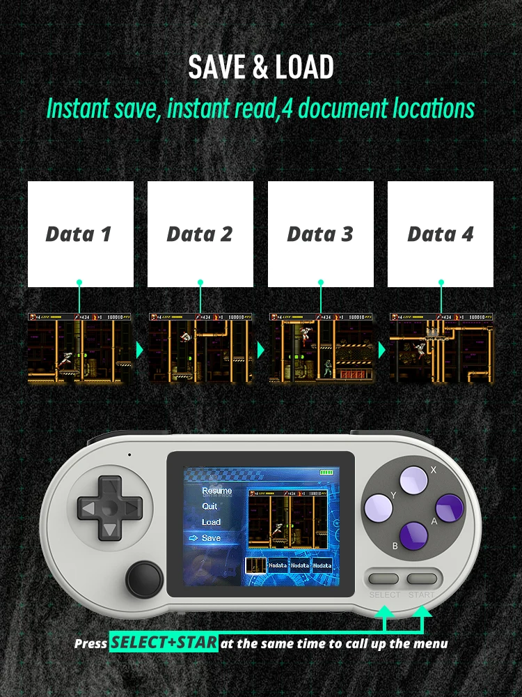 Soporte de archivo de juego. Cuando juegue, pulse el botón SELECT + STAR para guardar el progreso del juego/Salir/Reiniciar. Cuando continúe jugando la próxima vez, puede cargar y guardar el progreso sin reiniciar. Esta es una característica muy útil.