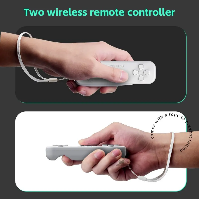 Dos controles remotos inalámbricos se utilizan para transmitir señales para controlar el juego. ¡Los jugadores pueden personalizar el cuerpo para conducir el juego! Nuestros controladores también vienen con un cable de protección contra caídas. ¡Puedes mantenerlo en tu mano para evitar que el controlador del juego se caiga con una sacudida violenta! Plug and play, fácil de operar, sin necesidad de operar, los jugadores solo necesitan agitar el mango para experimentar Var