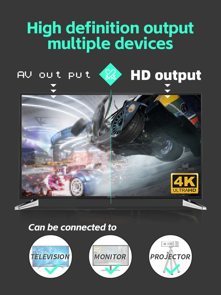 Nuestras consolas de juegos más nuevas admiten salida 4K HD. Más importante aún, ¡ambos admiten la salida del proyector doméstico! Ya no tendrá que preocuparse por el televisor en casa que no admite salida 4K HD y se perderá el juego. Siempre que tenga un dispositivo proyector, el proyector tiene una interfaz de salida HD, sin ninguna configuración ni operación, ¡Plug and Play! Puede disfrutar de un tiempo de juego feliz.