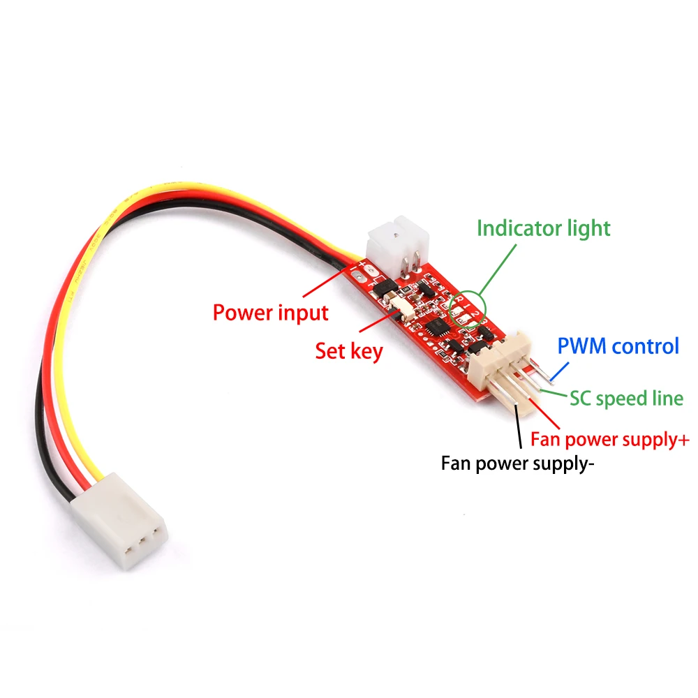 1.Este controlador solo puede controlar un ventilador PWM estándar de 4 cables de 12 V.La velocidad del ventilador se controla a través de señales PWM y el cambio de velocidad real del ventilador se ve afectado por el propio diseño del ventilador.No se puede ajustar la velocidad para ventiladores normales de 2 a 3 cables.