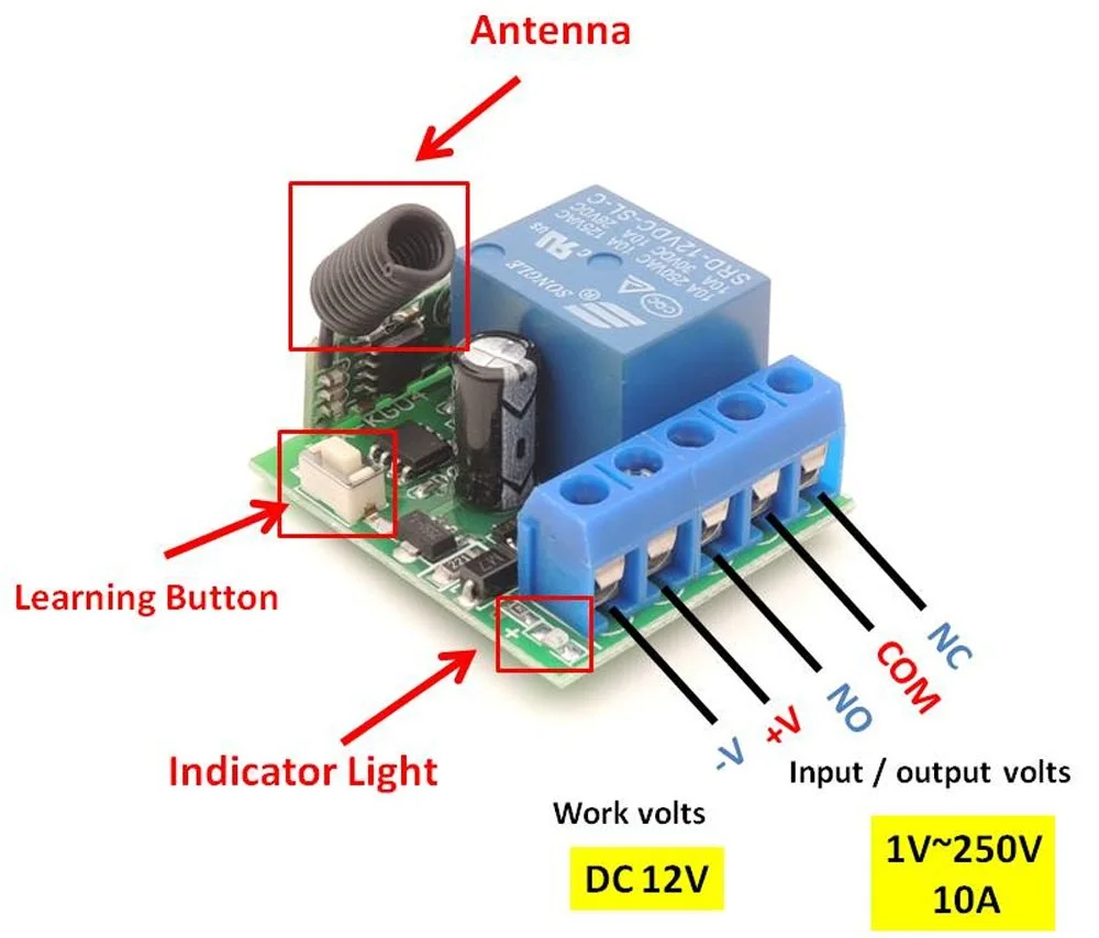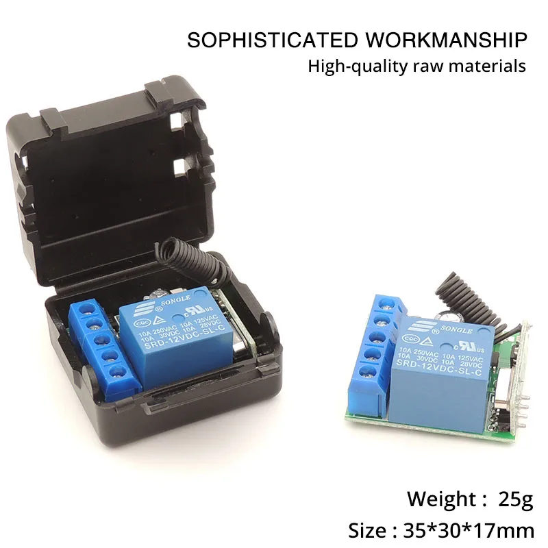 • Receptor de relé CC 12 V 10 A:Equipado con un receptor de relé DC 12V 10A, este mini módulo proporciona un rendimiento confiable y consistente para sus necesidades de control de puerta.
