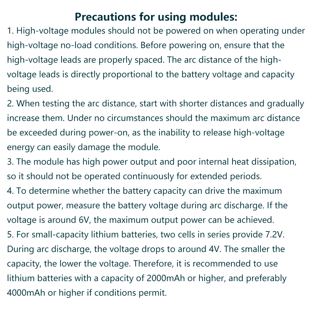 1.El módulo de alto voltaje debe evitar que se encienda en condiciones de alto voltaje sin carga.Antes de encender, se debe ajustar la distancia adecuada entre los cables de alto voltaje.La distancia del arco de los cables de alto voltaje es directamente proporcional al voltaje y la capacidad de la batería utilizada.