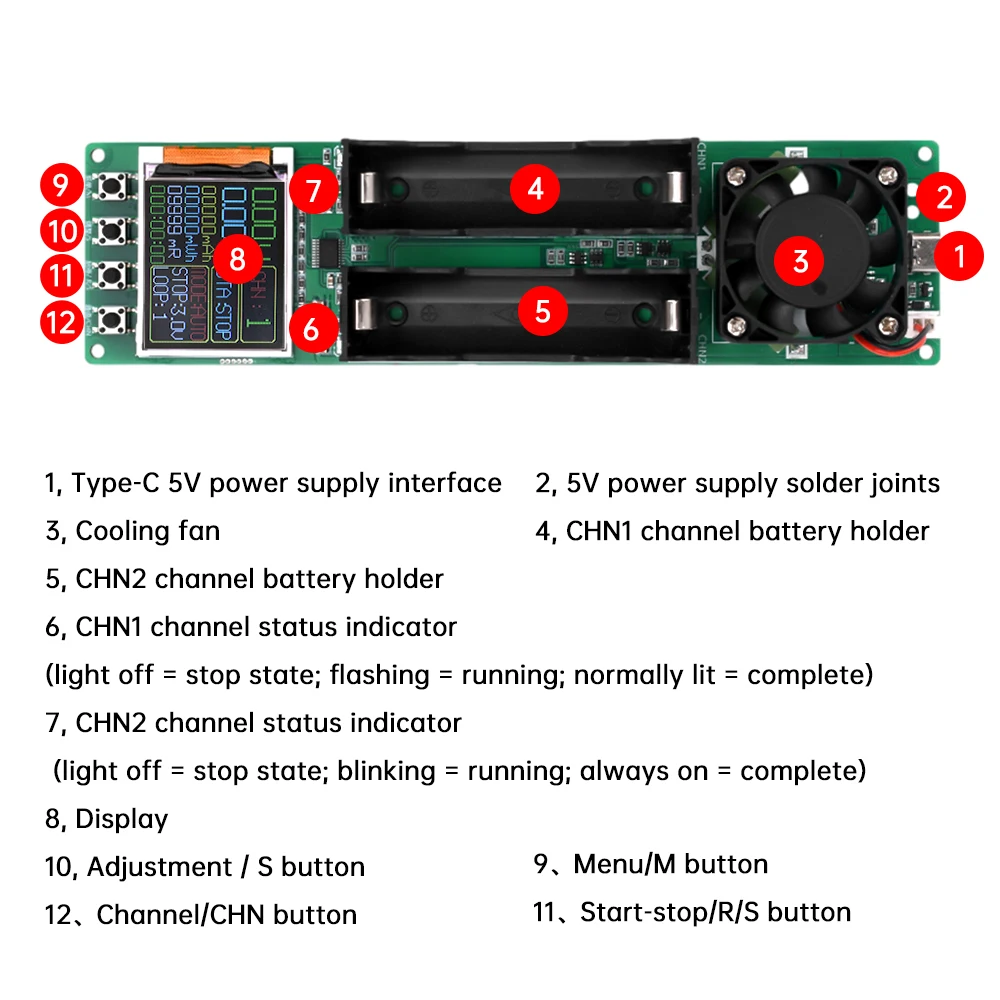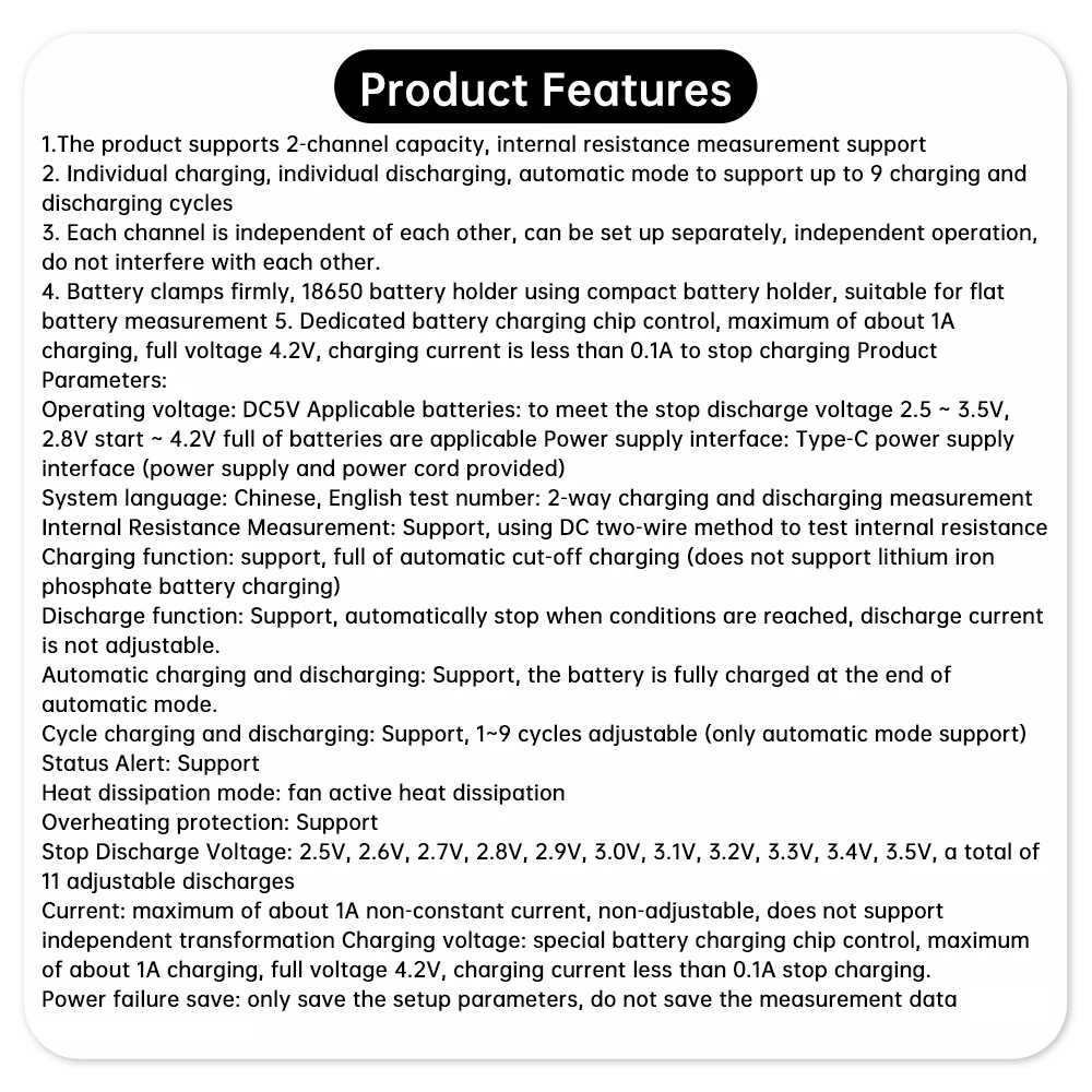 Voltaje de funcionamiento: CC 5 V Baterías aplicables: cumple con el voltaje de parada de descarga de 2,5 ~ 3,5 V, arranque de 2,8 V ~ 4,2 V lleno de baterías son aplicables Interfaz de fuente de alimentación: interfaz de fuente de alimentación tipo C (fuente de alimentación y cable de alimentación incluidos) Idioma del sistema: chino, inglés Cantidad de prueba: medición de carga y descarga bidireccional Medición de resistencia interna: soporte, utilizando el método de dos cables CC para probar la resistencia interna. Función de carga: soporte, carga de corte automático (no admite carga de batería de fosfato de hierro y litio) Función de descarga: soporte, se detiene automáticamente cuando se alcanzan las condiciones, la corriente de descarga no es ajustable. Carga y descarga automáticas: soporte, la batería se carga completamente al final del modo automático. Carga y descarga cíclica: soporte, 1 ~ 9 ciclos ajustables (solo soporte de modo automático) Alerta de estado: soporte Modo de disipación de calor: disipación de calor activa del ventilador Protección contra sobrecalentamiento: soporte Voltaje de descarga de parada: 2,5 V, 2,6 V, 2,7 V, 2,8 V, 2,9 V, 3,0 V, 3,2 V, 3,3 V, 3,4 V, 3,5 V, ajustable en 11 pasos. Corriente de descarga: máximo de aproximadamente 1A corriente no constante, no ajustable, no admite transformación independiente Voltaje de carga: control de chip de carga de batería especial, carga máxima de aproximadamente 1 A, voltaje total 4,2 V, corriente de carga inferior a 0,1 A de parada de carga. Ahorro de corte de energía: guarde solo los parámetros de configuración, no guarde los datos de medición
