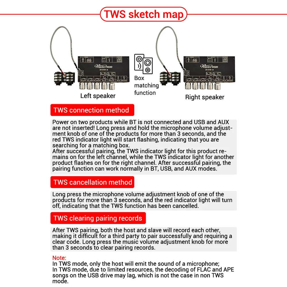 Estado de la luz indicadora: la luz azul parpadea lentamente en los modos USB y AUX, la conexión BT se realizó correctamente y permanece encendida, y parpadea muy lentamente cuando no hay conexión.Inicie TWS, la luz roja parpadea para buscar emparejamiento, la luz roja permanece en el canal izquierdo de TWS, la luz roja parpadea lentamente el canal derecho de TWS
