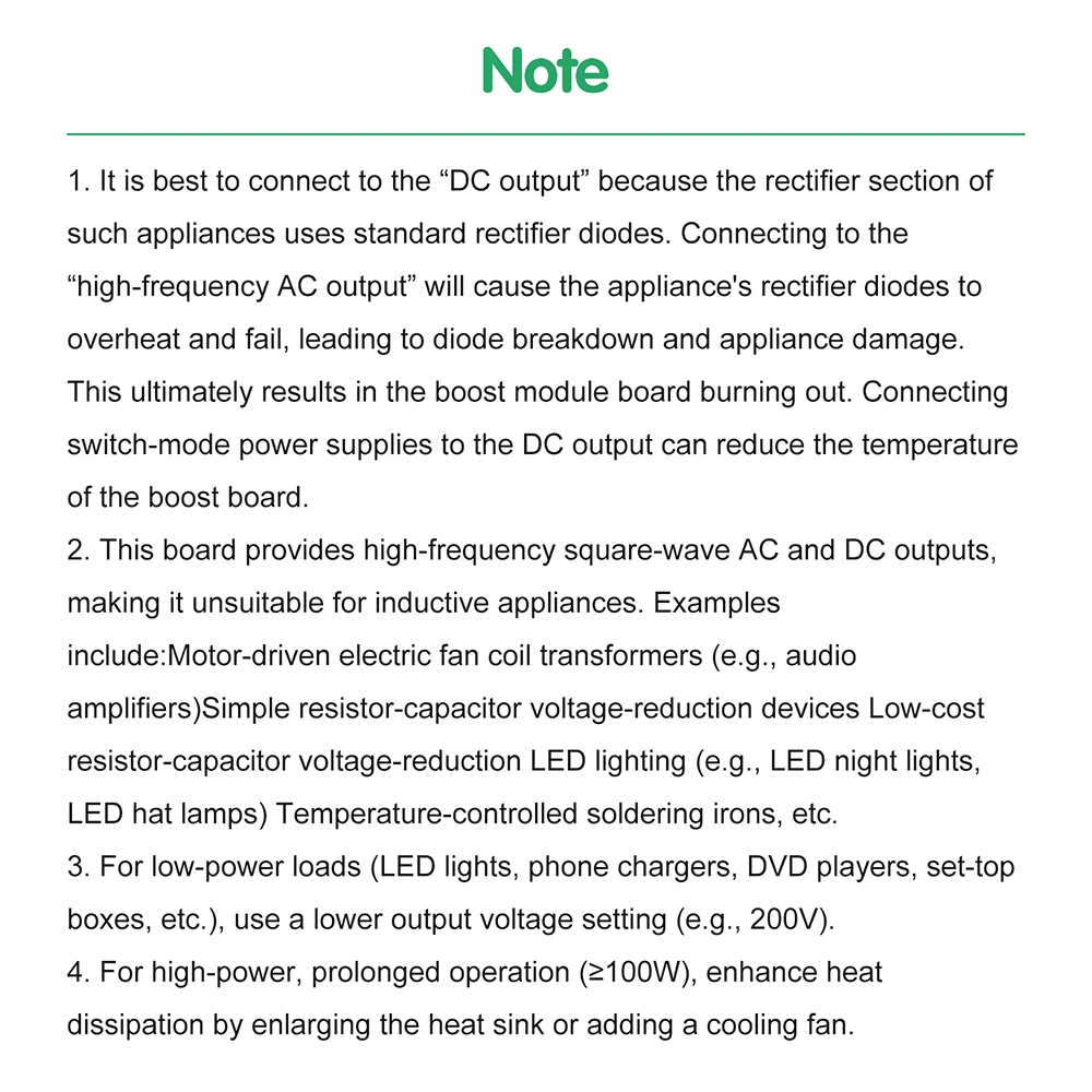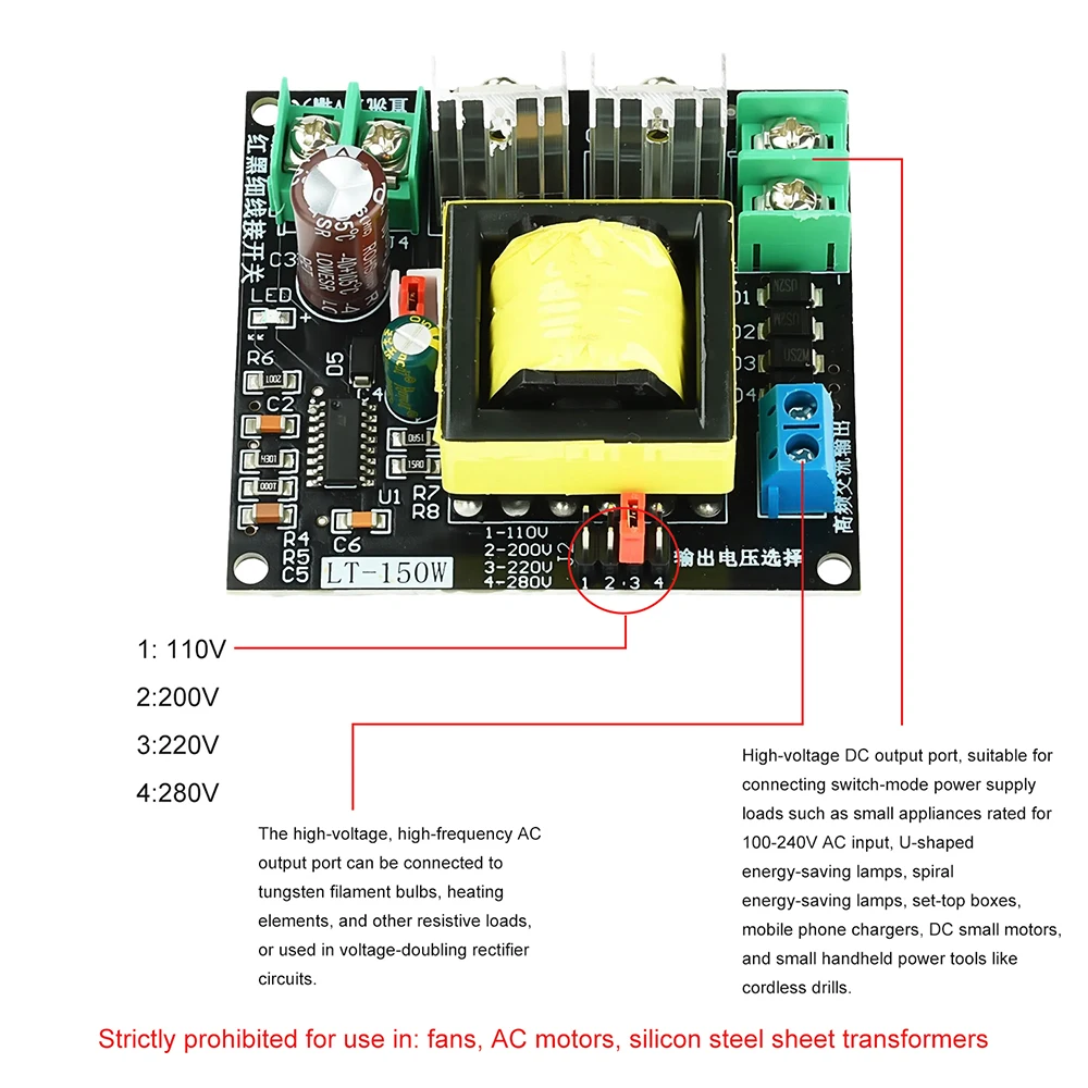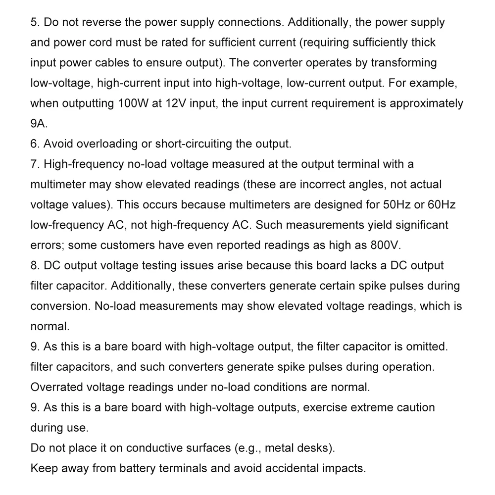 Input voltage: 12V, low limit input voltage: 8V, high limit input voltage: 14.8V. Please add a fuse. It is recommended to add a 15A fuse (lithium battery power supply and switching power supply, DC power supply, which will lead to overheating and burning of the pipe when the power supply is insufficient). The output voltage is not stabilized. The input power (current) should be sufficient, otherwise the pipe is easy to burn. Output voltage: 110V 200V 220V 280V Output waveform: high-frequency square wave or DC (unfiltered) Output power: 150W (please add fan for heat dissipation above 100W) No load 12V terminal current: 250mA Operating frequency: 27KHZ Protection: no protection, please add your own fuse