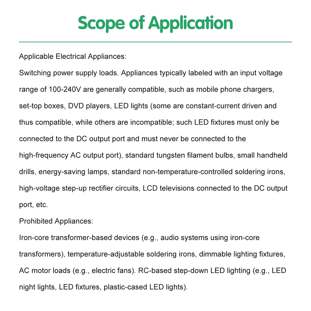 Applicant area: switching power supply type loads. Generally, electrical appliances with input voltage of 100-240V can be used, such as non counterfeit mobile phone chargers, set-top boxes, DVDs, LED lights (some are driven by constant current, so some can be used, and some LED lights cannot be used. When using, they can only be connected to the DC output port, and must not be connected to the high-frequency AC output port), ordinary tungsten filament bulbs, small electric drills, energy-saving lights, LCD TV is connected to DC output port, etc.
