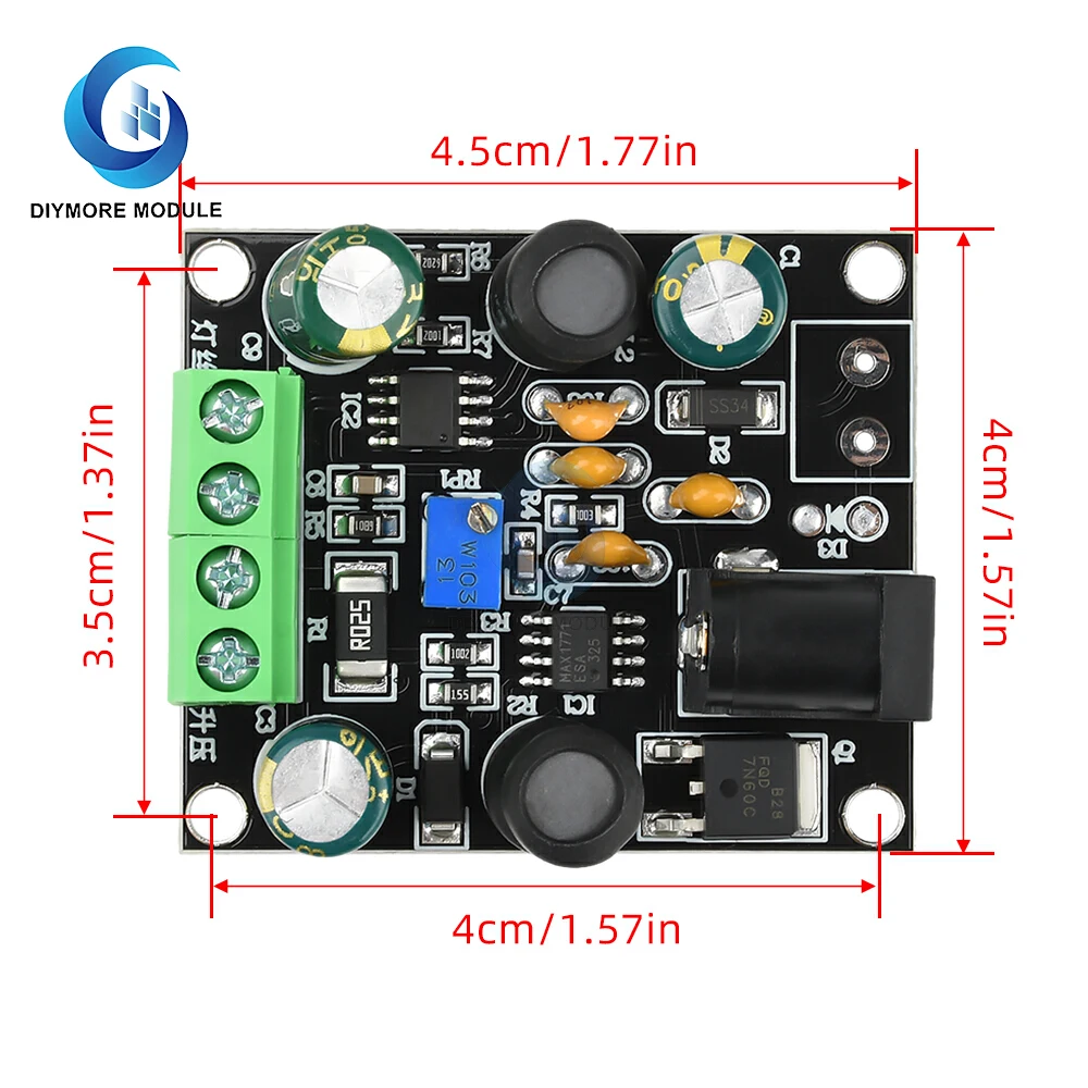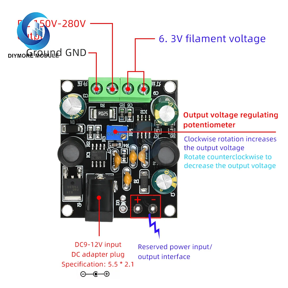 Output voltage adjustment potentiometer: Rotate clockwise to increase the output voltage; Rotate counterclockwise to decrease the output voltage