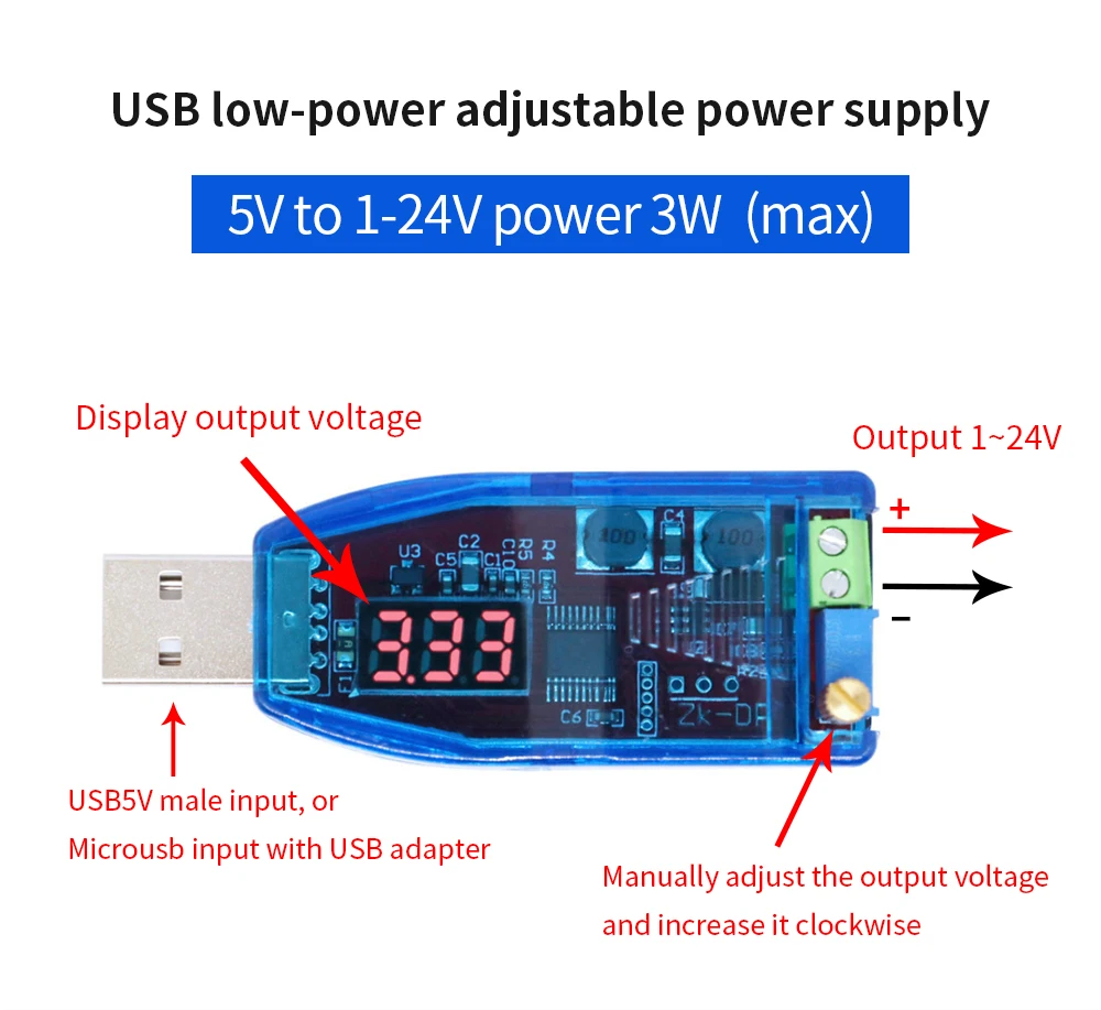 Comprar DC-DC LED de 5V a CC, 1-24V, USB, potenciómetro ajustable, módulo regulador de fuente de alimentación, 3W