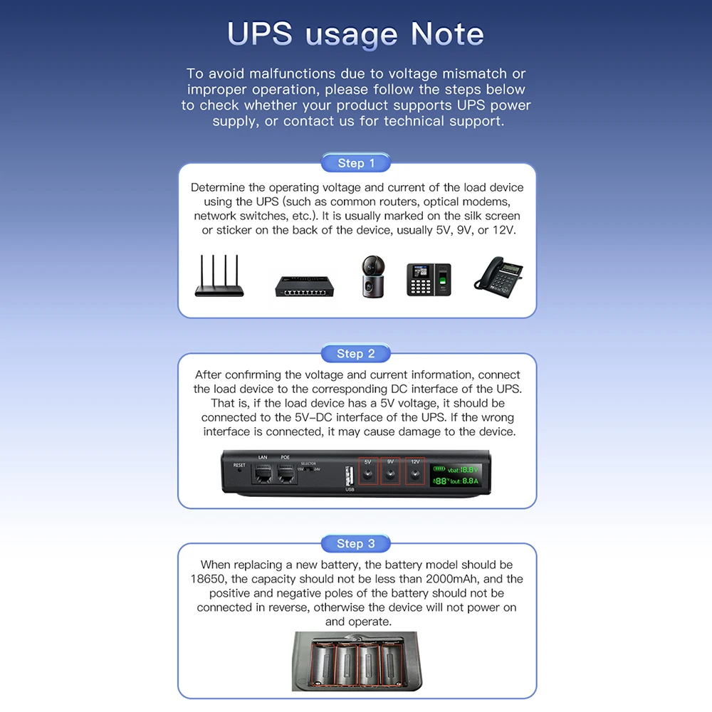 6. Múltiples interfaces de voltaje de salida: admite múltiples salidas de voltaje para voltajes CC comunes de 5v, 9v, 12v y 24v, cubriendo enrutadores, interruptores ópticos y otros dispositivos, hosts pequeños, etc.